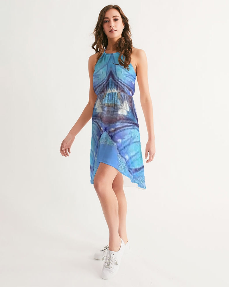 This stunning Women's High-Low Halter Dress is tailor-made for you in a strong but delicate way. Fashioned with a round neckline hem, elastic waist, and adjustable straps with gold metallic slides for a look you can dress up or down.